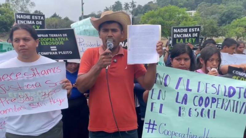 Los habitantes también hicieron un plantón con carteles de “No van a robarnos las tierras”, “Nadie está encima de la ley”, "No al desalojo en Cooperativa El Bosque”, entre otros.