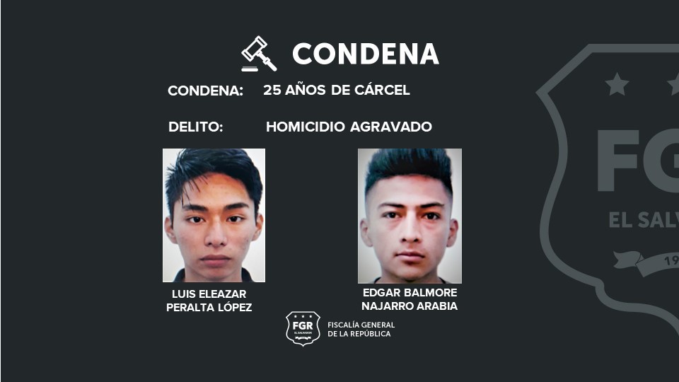 El Tribunal Cuarto de Sentencia de San Salvador le impuso una condena de 25 años a Luis Eleazar Peralta López y Edgar Balmore Najarro Arabia, tras comprobarse su culpabilidad por el delito de homicidio agravado en perjuicio de una mujer.