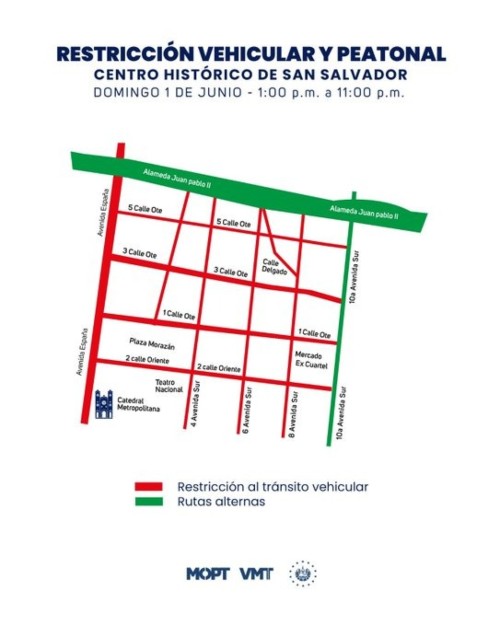 “Desde la 1:00 p.m. a las 11:00 p.m. de este domingo 1 de junio, mantendremos dispositivo de restricción a la circulación vehicular y peatonal en el Centro Histórico de San Salvador”, indicó el VMT.