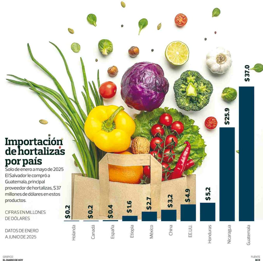 Del total de hortalizas importadas, $37 millones se pagaron a Guatemala, $25.9 millones a Nicaragua y unos $5.2 millones a Honduras; también se le compró a Estados Unidos, China, México, Etiopía, España, Canadá y hasta Holanda.