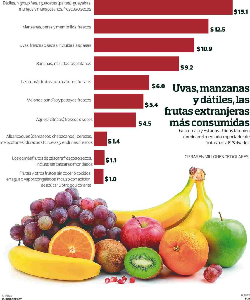 Y si bien El Salvador es un país tropical, también se importan piñas, guineos, aguacates y hasta cocos.