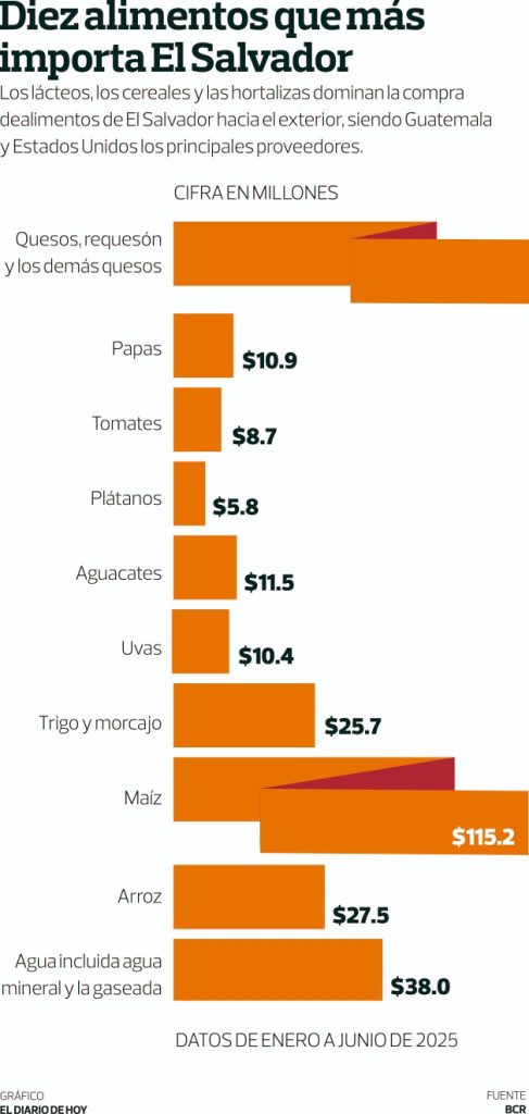 A pesar de considerarse un país agrícola, gran parte del frijol y el maíz que llega a las mesas es traído del exterior, así como más del 93% de las frutas y hortalizas, además del 70% del queso, según información de gremiales de productores y datos de importaciones del Banco Central de Reserva (BCR).