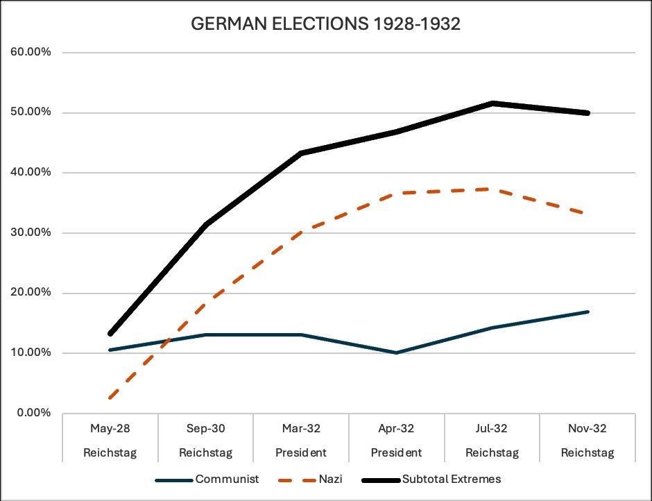 —El siguiente gráfico ilustra cómo se estaba derrumbando el centro en Alemania durante el fin de los años veinte y el principio de los treinta. De mayo de 1928 a noviembre de 1932, cuando la Gran Depresión comenzó y empeoró, los dos partidos que abogaban por la tiranía en lugar de la democracia —los comunistas y los nazis— aumentaron sus votos de 4,0 millones a 17,7 millones. En solo cuatro años, Alemania pasó de ser un país donde los extremistas eran marginados a uno donde la mitad de los votantes apoyaban la destrucción de la democracia a través del nazismo o el comunismo. Nótese que los comunistas dominaron inicialmente el panorama