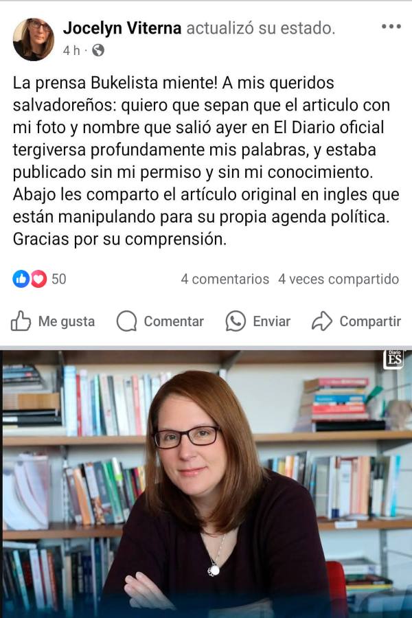 Unos días después, mi teléfono empezó a sonar. Mis colegas salvadoreños me enviaban un enlace a la edición del 17 de mayo del Diario El Salvador, el periódico oficial del régimen de Bukele, donde mi nombre y mi foto aparecían en la portada, junto con el título: "Profesora de Harvard elogia al presidente Bukele por la reducción de la violencia de pandillas". El artículo que acompañaba la entrevista extrajo algunas frases de la entrevista de Harvard Gazette para respaldar su conclusión de que había brindado un ferviente respaldo al liderazgo de Bukele. De hecho, la versión digital del artículo se titulaba: "Docente de Harvard destaca liderazgo y política de Bukele".