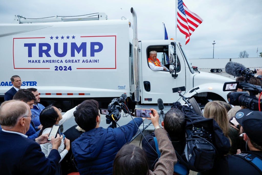 Trump se sube a camión de basura en protesta por comentario de Biden sobre sus seguidores