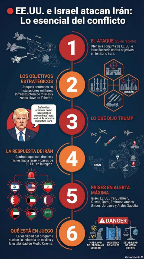Estados Unidos e Israel lanzaron una ofensiva conjunta contra objetivos estratégicos en Irán este 28 de febrero. El presidente Donald Trump aseguró que el objetivo es “destruir sus misiles y arrasar su industria misilística”, mientras Teherán respondió con drones y proyectiles contra Israel y bases estadounidenses en la región.