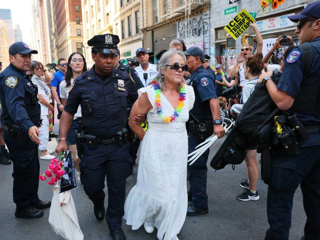 Agentes del Departamento de Policía de Nueva York (NYPD) arrestaron a manifestantes por bloquear el tráfico en Broadway mientras protestaban contra los arrestos masivos de migrantes. /Foto de AFP.