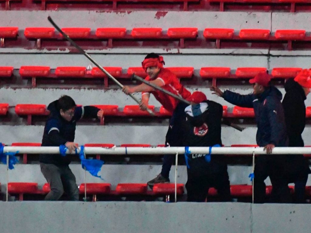 Parcialidades de ambos equipos se enfrentaron en las gradas del Estadio Libertadores de América, hogar de los Diablos Rojos en el sur de Buenos Aires, con golpes de palos y puños en una feroz pelea de la que incluso un hincha -aparentemente chileno- buscó escapar arrojándose al vacío desde la bandeja superior tras ser acorralado por otros fanáticos.