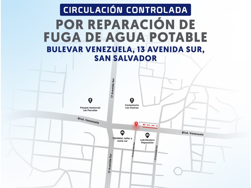 La Administración Nacional de Acueductos y Alcantarillados (ANDA) realizará esta noche una intervención técnica para reparar una fuga de agua potable en el carril exterior del Bulevar Venezuela, específicamente en el tramo que va de oriente a poniente, a la altura de la 13.ª avenida Sur, en San Salvador Centro.