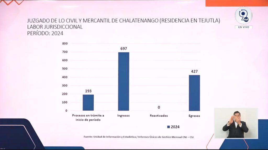 Para el periodo de 2024 el tribunal de Tejutla inició trámite a 193 casos, tuvo 697 ingresos, ninguna reactivación y 427 egresos.