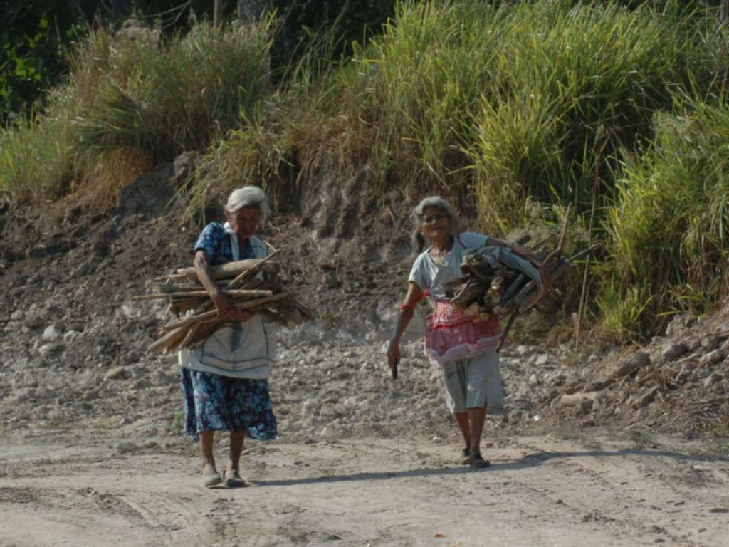 Dos habitantes de la finca El Espino recolectaban leña en la calle Diego de Holguín, como se conoció inicialmente la carretera Monseñor Romero, cuando inició su construcción. Fotografía / Archivo