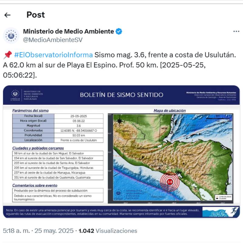 Ambos sismos fueron catalogados como eventos frente a la costa de Usulután y, de acuerdo con las autoridades, no representan amenaza de tsunami ni se reportan daños materiales, de forma inmediata no se registran personas afectadas.