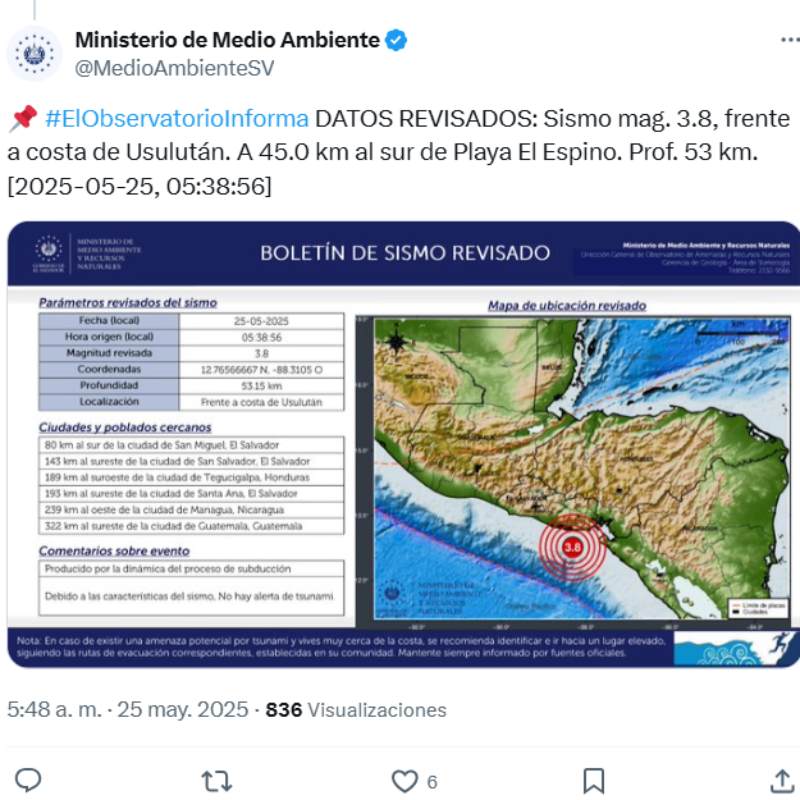 Minutos después, a las 5:38 a. m., se reportó un segundo sismo, esta vez con una magnitud de 3.8 grados, localizado a 45 kilómetros al sur de Playa El Espino, con una profundidad de 53 kilómetros.