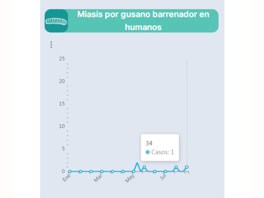 El quinto caso humano de gusano barrenador fue reportado entre el 17 y 23 de agosto de 2025, según el boletín epidemiológico./Captura de pantalla de los resultados estadísticos del boletín epidemiológico del Ministerio de Salud.