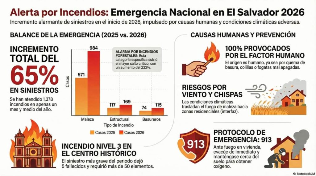 Los incendios en El Salvador muestran un incremento significativo en enero y febrero de 2026, especialmente los incendios en maleza y forestales, de acuerdo con cifras oficiales del Cuerpo de Bomberos de El Salvador. Entre el 1 de enero y el 16 de febrero de 2026 se atendieron 1,378 emergencias por fuego, frente a 834 en el mismo período de 2025, lo que representa un alza del 65%.