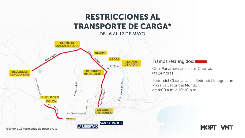La restricción es a partir de los vehículos de carga desde las 15 toneladas de peso bruto (camión pesado de dos ejes) en adelante que circulan en el tramo comprendido desde los redondeles Claudia Lars, Corinca, Integración y Constitución hasta la Plaza Salvador del Mundo.