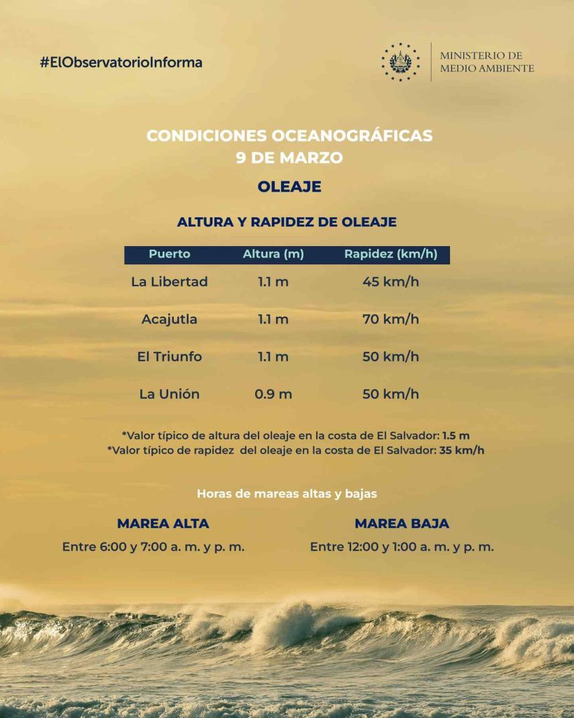 Para el miércoles 11 de marzo, la rapidez del oleaje podría alcanzar 55 kilómetros por hora, con olas de hasta 1.7 metros en Punta Remedios y 1.5 metros en Punta Roca, el Estero de Jaltepeque y la Bahía de Jiquilisco.