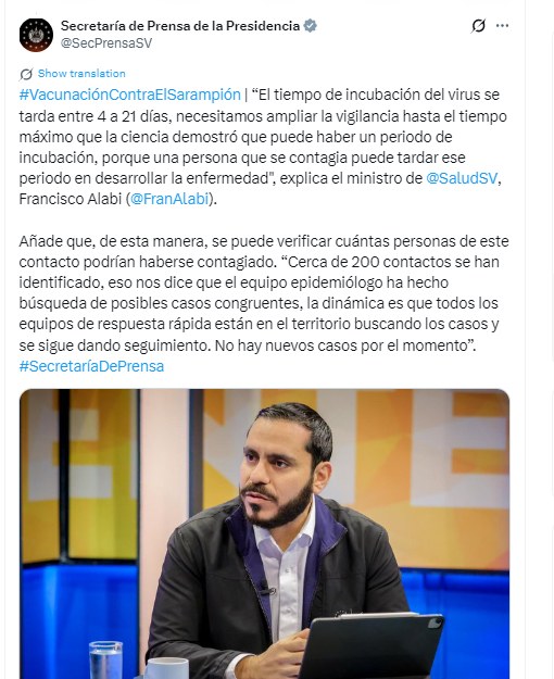 El Salvador mantiene un monitoreo activo sobre cerca de 200 personas que han tenido contacto con casos importados de sarampión, en un contexto donde el país continúa sin transmisión local y se mantiene con 11 casos confirmados hasta la fecha, sin nuevos contagios, informó el ministro de Salud, Francisco Alabi.