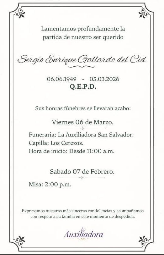 Familiares del comunicador deportivo Sergio Enrique Gallardo del Cid informaron los detalles de sus honras fúnebres en San Salvador. El velatorio se realiza este viernes 6 de marzo en la funeraria La Auxiliadora, en la capilla Los Cerezos, a partir de las 11:00 a.m., donde amigos, colegas y seguidores podrán despedirse del reconocido locutor. La misa de despedida está programada para el sábado 7 de marzo a las 2:00 p.m. Gallardo falleció el 5 de marzo de 2026 a los 73 años. Durante décadas fue una voz emblemática del periodismo deportivo salvadoreño, recordado por su participación en radio, televisión y programas como “¿Cómo Quedaron?”.