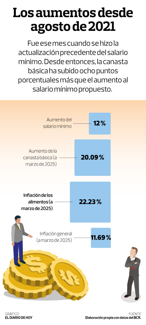 Danilo Pérez, del no gubernamental Centro para la Defensa del Consumidor (CDC), plantea que el incremento salarial tendría que ser al menos del 25%, es decir más del doble que lo planteado desde el Gobierno. Sin embargo, eso implicaría un salario de $456.25 ($409 líquidos), lo que continuaría siendo insuficiente.