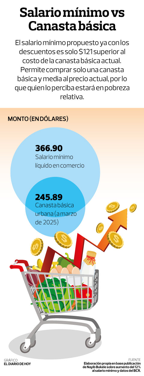 El nuevo incremento propuesto por Bukele es del 12% y si esto se llega a concretar, la ciudadanía tendría un poder adquisitivo menor que el establecido en agosto de 2021. En ese mes, una persona con sueldo base, ya con sus descuentos, compraba 1.6 canastas básicas.