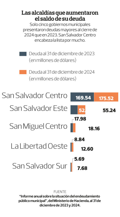 San Salvador Centro es el municipio más endeudado del país, con $175.52 millones al cierre de 2024, casi $6 más que el saldo de 2023. Solo el año recién pasado la municipalidad tuvo desembolsos por $16.46 millones.