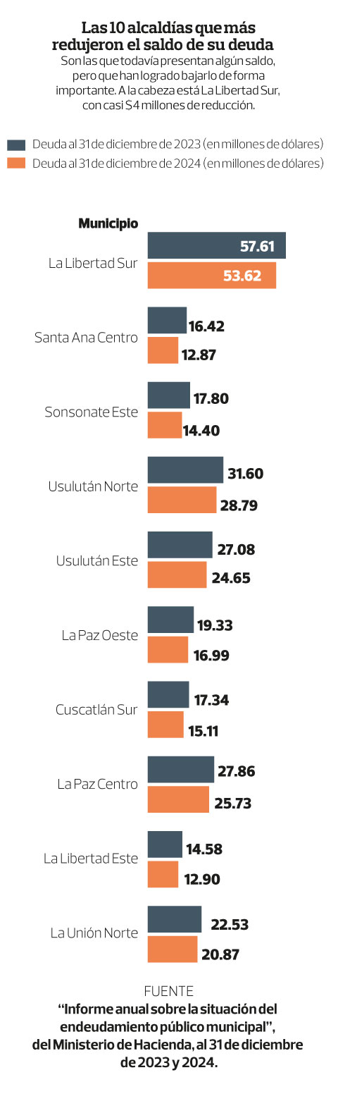 Según el Ministerio de Hacienda, las deudas de La Libertad Sur al final de 2023 eran de $57.61 millones. Al cierre de 2024 habían bajado en casi $4 millones, lo que coloca a este municipio como el que más disminuyó su deuda en el pasado ejercicio.