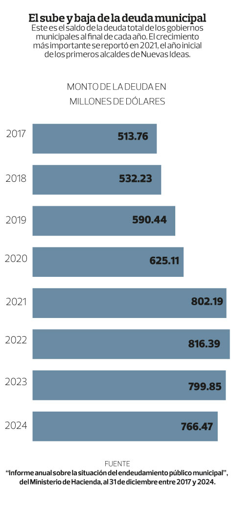 Según los datos oficiales, es posible comprobar que el gran salto de la deuda municipal se vivió en 2021, cuando tomaron posesión las primeras alcaldías de Nuevas Ideas. El aumento fue de $177 millones, un alza desproporcionada si se toma en cuenta que al aumento promedio entre años ronda los $40 millones. Es decir que, en un solo ejercicio, el promedio aumentó cuatro veces.