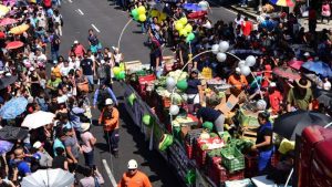 h-Noticias 03-08-2024 Comerciantes de La Tiendona tiraron frutas y verduras en vez de dulces en Desfile del Comercio