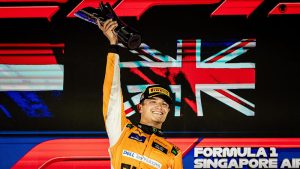 El piloto británico de Mercedes, George Russell, celebra su victoria tras el Gran Premio de Singapur de Fórmula 1, disputado de noche en el circuito urbano de Marina Bay, el 5 de octubre de 2025.
