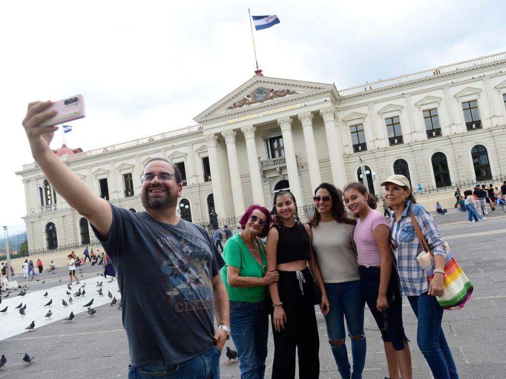 Fernando Preda y su familia viajan al país desde Guatemala. En la imagen, posan para una selfie en la Plaza Gerardo Barrios.