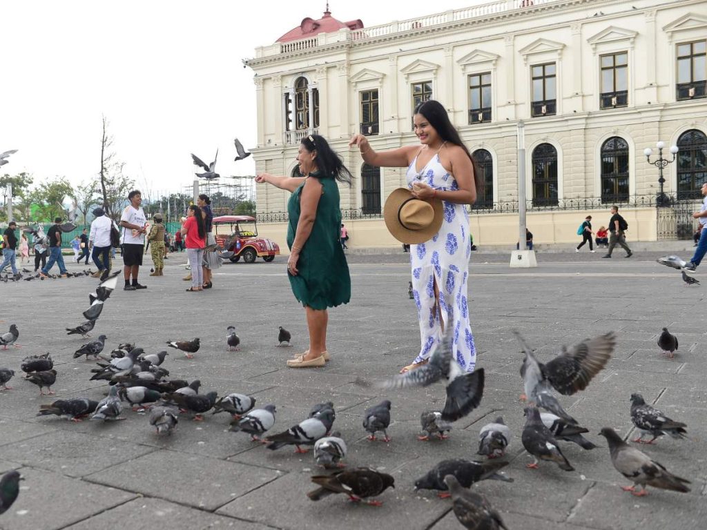 Yani Escobar y su madre visitan El Salvador desde Honduras como parte de una actividad laboral. En la imagen, alimentan a pájaros en la Plaza Gerardo Barrios.