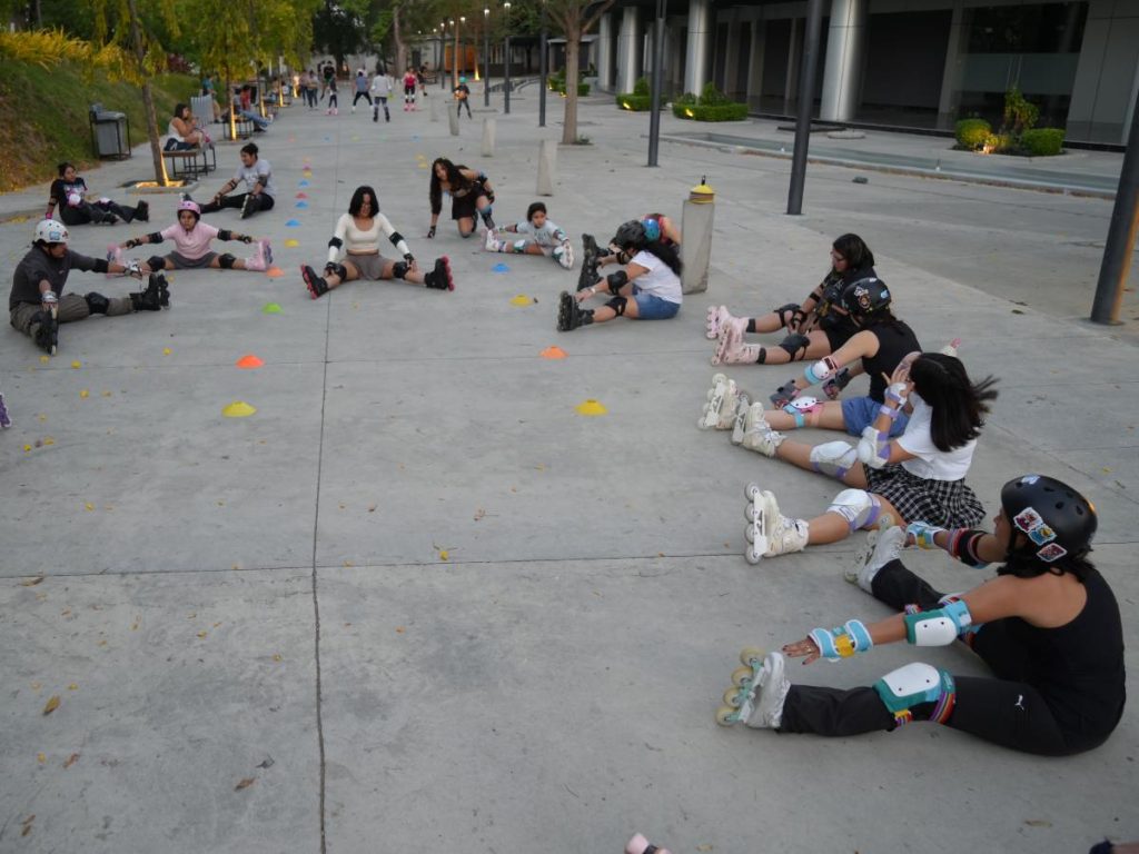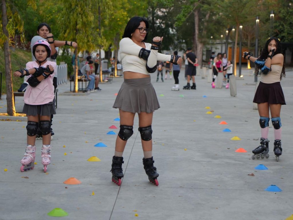 Cae la tarde en la capital. Las ruedas girando sobre el pavimento. Cascos ajustándose. Estiramientos antes de empezar. En ese espacio abierto frente al gimnasio, la rutina nocturna tiene un ritmo distinto. Entre conos de práctica, música y risas, niños, adultos jóvenes y personas mayores comparten un mismo objetivo: moverse, divertirse y aprender algo nuevo.