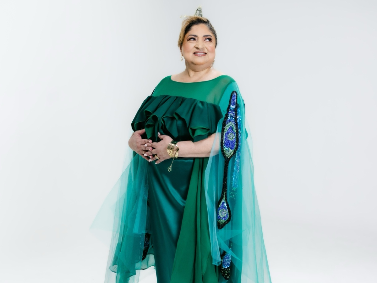 Diseñado por Rossemberg Rivas, este concepto se construye desde una paleta vibrante que transita entre verdes, tonos aqua, efectos tornasol y acentos ultravioletas. Pero más allá del impacto cromático, la pieza se sostiene en una intención clara: convertir el vestuario en un mensaje cultural que dialogue con la historia del país y con la trayectoria de una artista que ha marcado generaciones.